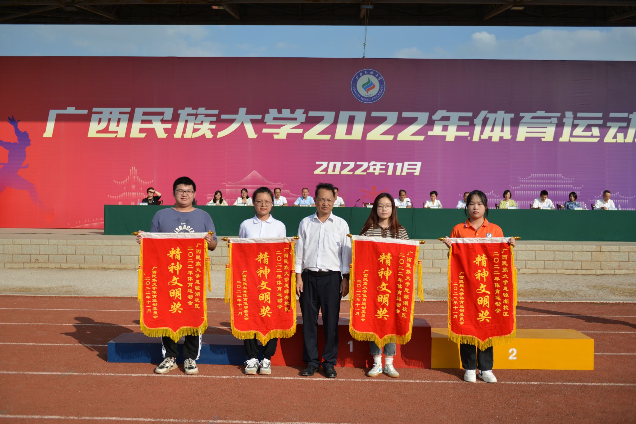校運會總裁判長宣布各學院比賽成績,精神文明評獎組宣布“精神文明獎”“優秀組織獎”評選結果,校領導為獲獎學院代表頒獎。