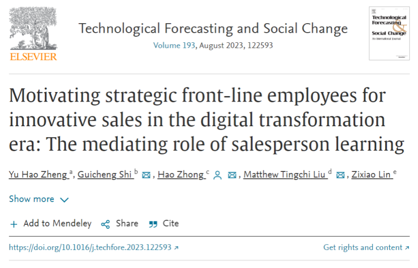 近日,廣西民族大學(xué)管理學(xué)院工商管理系鄭宇豪博士在國際權(quán)威期刊Technological Forecasting and Social Change(《技術(shù)預(yù)測與社會變革》)以第一作者身份發(fā)表其研究成果Motivating strategic front-line employees for innovative sales in the digital transformation era: The mediating role of salesperson learning(《在數(shù)字化轉(zhuǎn)型時代對策略性一線員工創(chuàng)新銷售的激勵研究:銷售人員學(xué)習(xí)的中介作用》)。該研究的發(fā)表向全世界展示了來自中國廣西的旅游企業(yè)在應(yīng)對數(shù)字化轉(zhuǎn)型方面的優(yōu)秀經(jīng)驗與成果。
