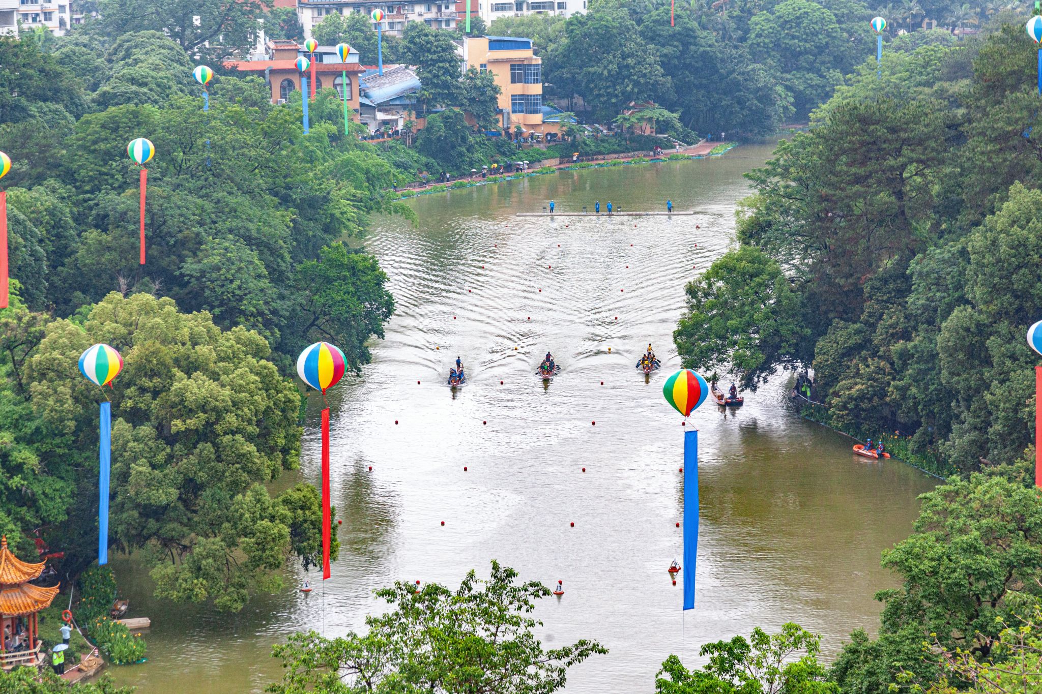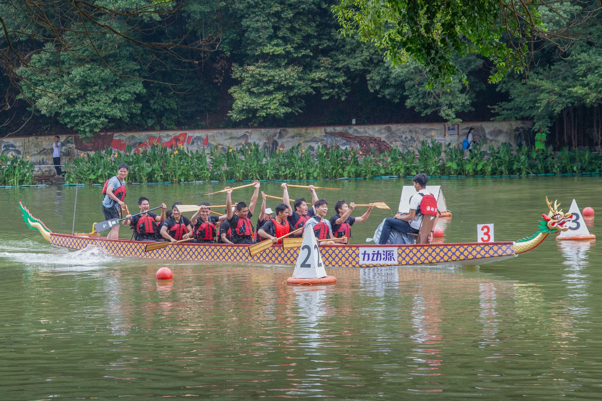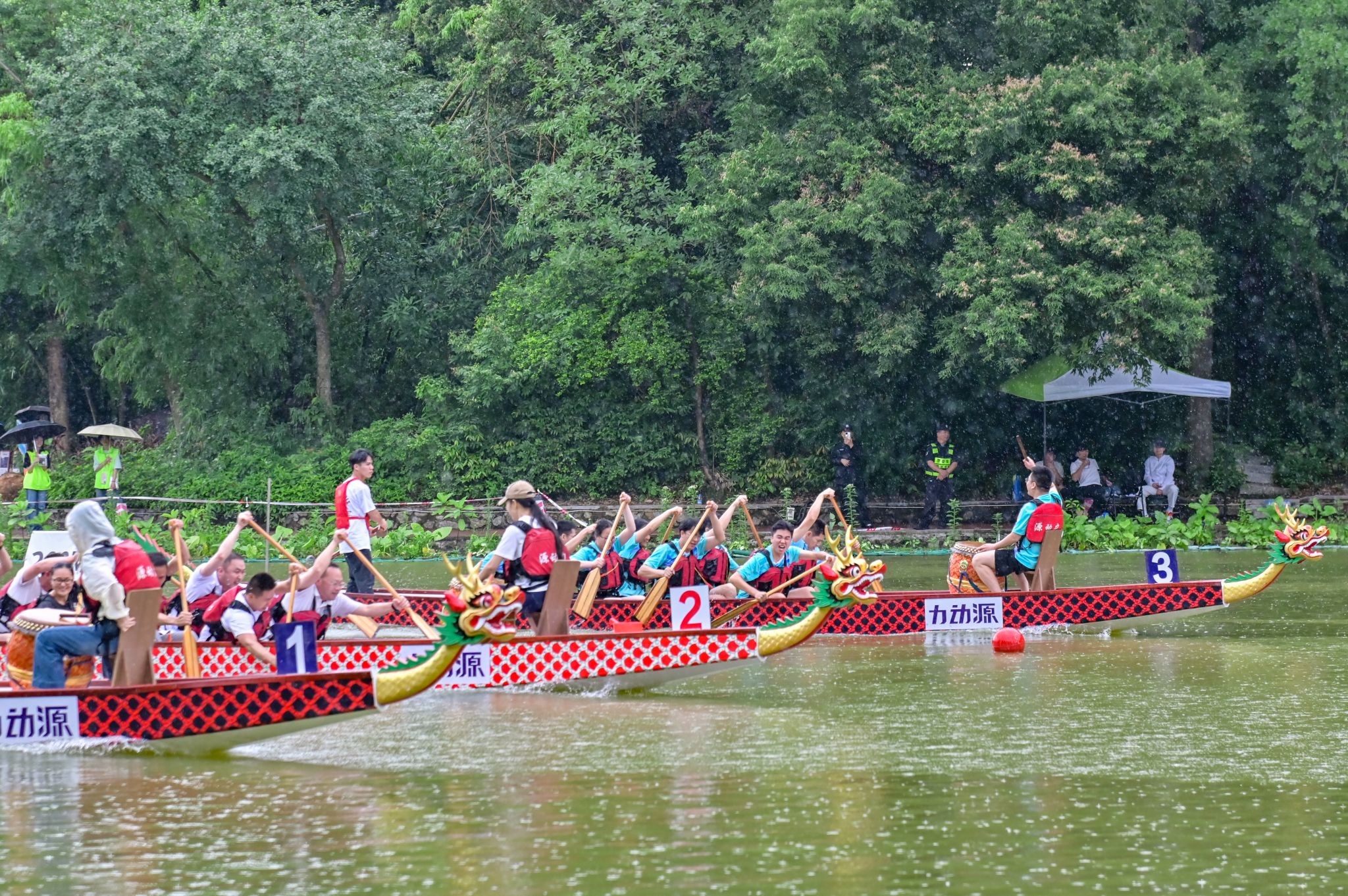 上午9時許,伴隨著震天鼓聲,比賽正式開始。發號聲響,河中龍舟猶如蛟龍出水,勢如破竹,極速前進。鼓手奮力擊鼓,槳手們齊喊口號、揮槳如飛,彼此配合默契,動作整齊劃一,平靜的湖面水花四濺,激起一陣陣波瀾。現場熱鬧非凡,鼓聲、吶喊聲、加油聲、口號聲此起彼伏,奏響拼搏奮斗的激昂樂章。