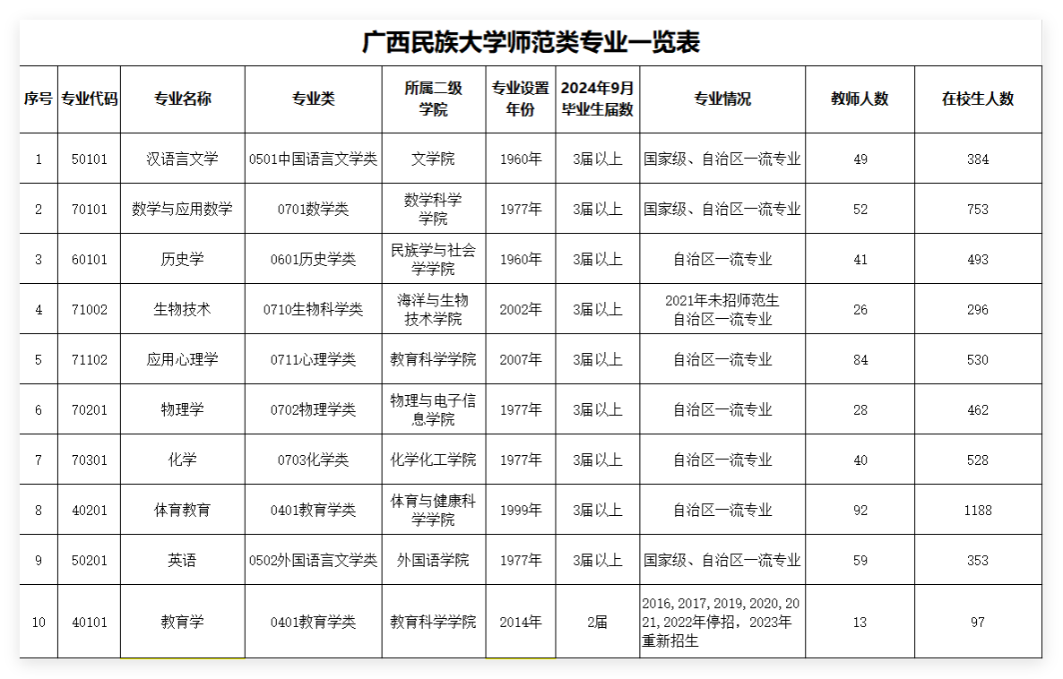 長期以來,廣西民族大學堅守“為民族地區育良師,為民族團結鑄根基”的初心使命,堅持“民族為根,師能為本”的育人理念,深耕師范生培養改革。學校以師范類專業認證為牽引,系統構建“通識教育+學科專業+教師教育+實踐創新”四位一體課程體系,融入民族理論、名師案例與鄉村教育實踐,厚植師范生家國情懷與教育初心;深化校地協同育人,共建實踐基地百余個,創新“雙導師”指導模式,強化教學技能與職業素養;建立“評價—反饋—改進”質量閉環,推動人才培養與基礎教育需求精準對接。近年來,學校師范生在省級以上競賽中屢獲佳績,多個專業入選國家級、省級一流本科建設點,多項教學成果獲省級獎項,為民族地區基礎教育高質量發展注入強勁動力。現有師范類專業10個,其中國家級、省級一流本科專業建設點9個。