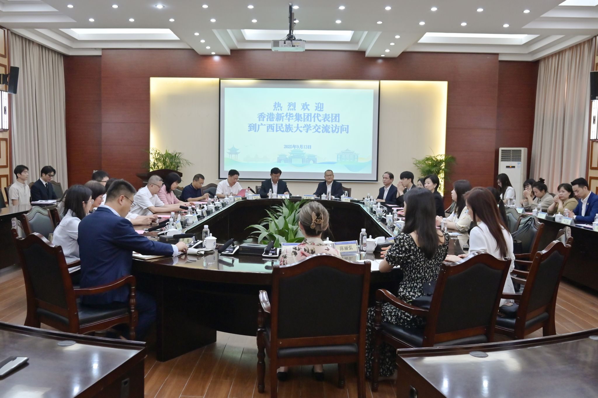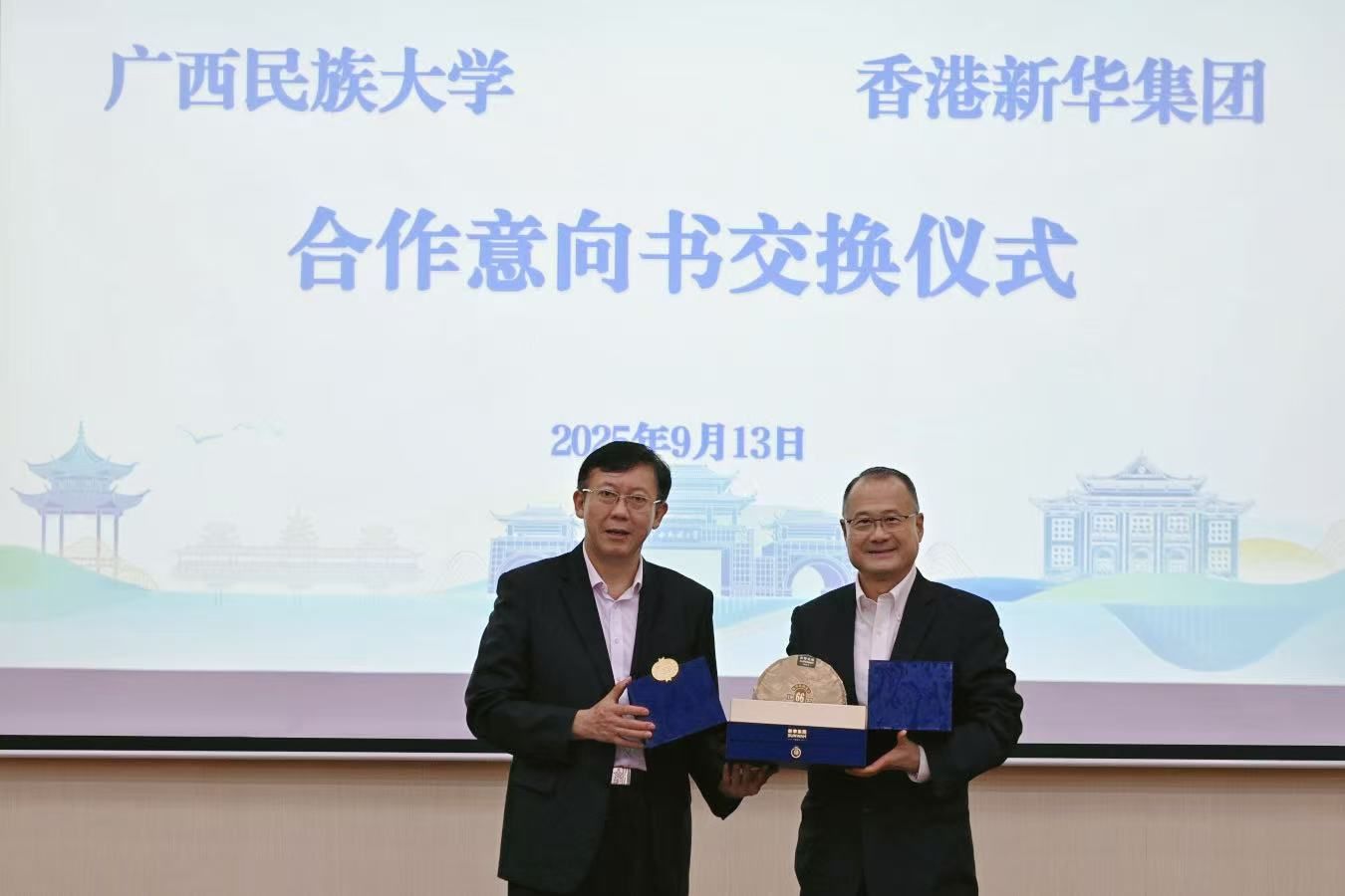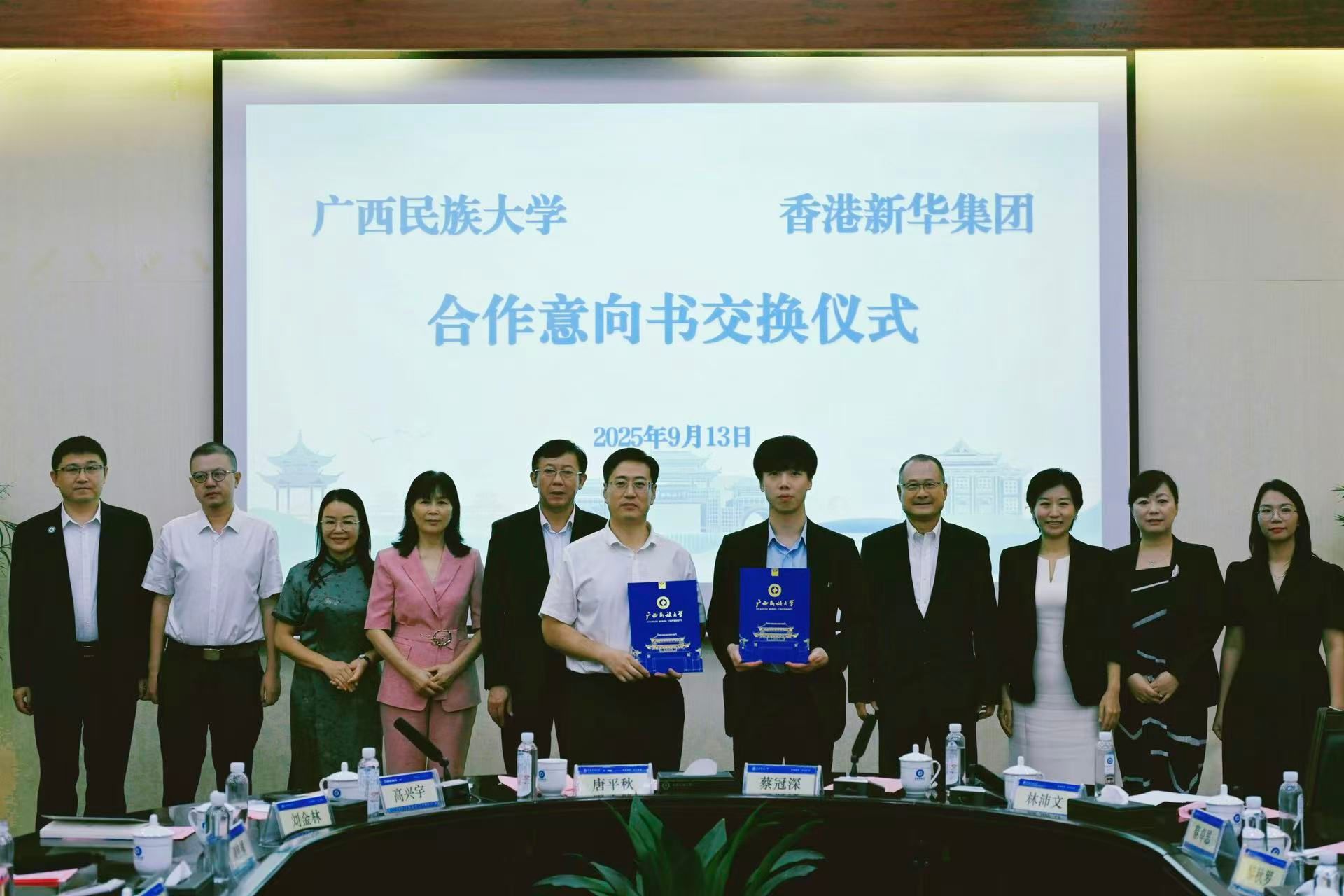 蔡冠深表示,香港新華集團在東盟地區深耕多年,積累了豐富的資源和人脈,在文化教育領域成果顯著,希望能與廣西民族大學在面向東盟的國際交流板塊開展全方位合作,依托學校非通用語種的專業優勢與集團當地資源,積極推進語言培訓、文化交流、聯合人才培養及共建研究基地等各領域合作,探索人工智能與非通用語種的融合應用及非物質文化遺產的國際傳播。