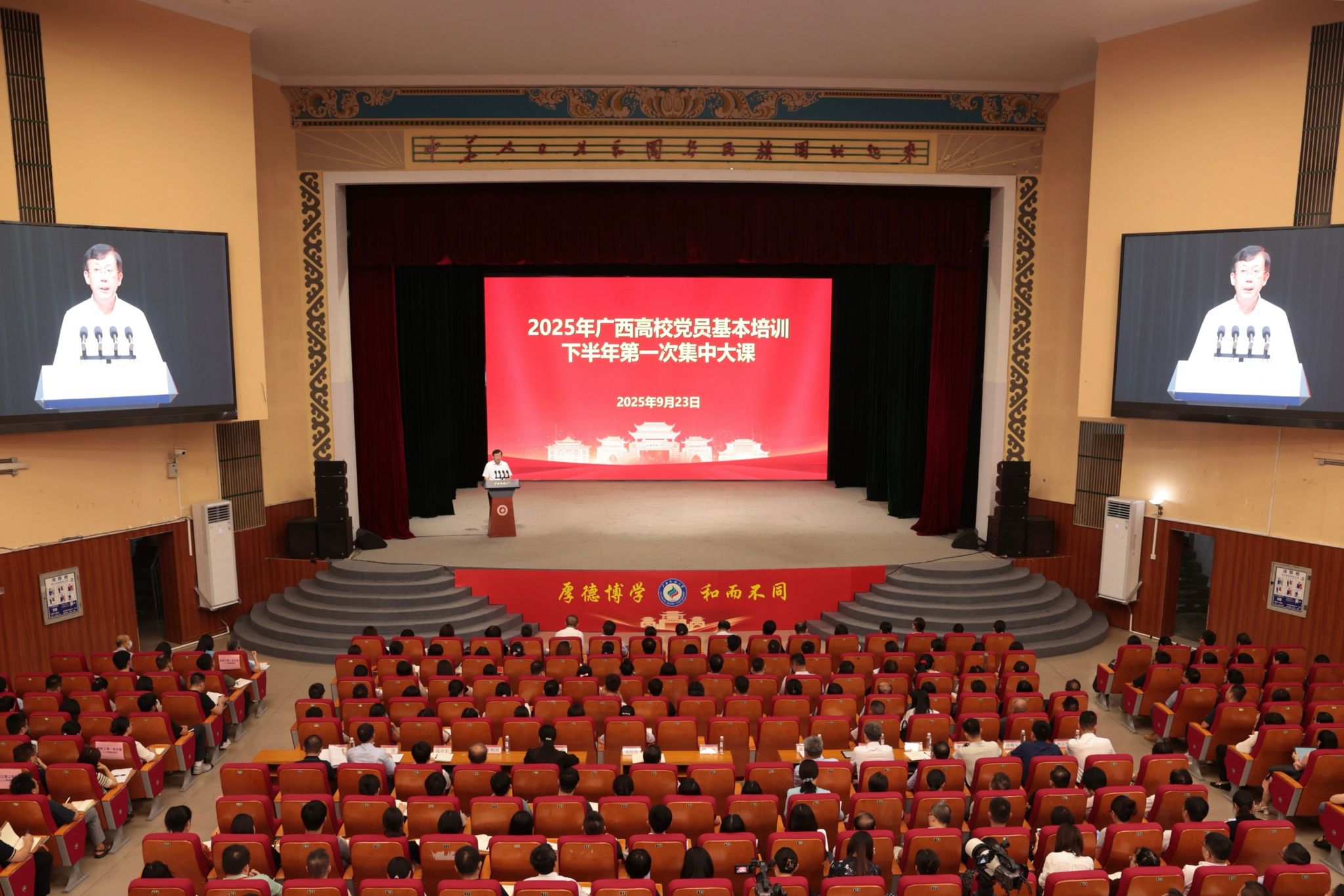 9月23日,廣西高校2025年黨員基本培訓下半年第一次集中大課在廣西大學、廣西師范大學、廣西民族大學、桂林電子科技大學同時舉行。自治區黨委黨校常務副校長、廣西行政學院常務副院長、二級教授牛先鋒為培訓作專題輔導報告,廣西大學黨委書記李國忠主持。自治區黨委教育工委專職副書記覃壯才、自治區黨委宣傳部二級巡視員周三勝、自治區黨員教育中心二處處長蒙杰等同志在廣西大學主會場參加學習。4所高校3萬余名師生黨員,通過線上線下結合的方式共同參加學習。我校設置主分會場48個,學校黨委書記唐平秋作培訓動員講話并提工作要求。