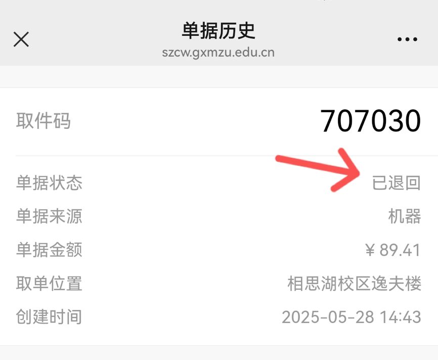 4.如發生退單,相關信息將通過微信公眾號信息推送形式通知報銷申請人。點擊“查看詳情”進入后,即可查看具體退單地點和取件碼。