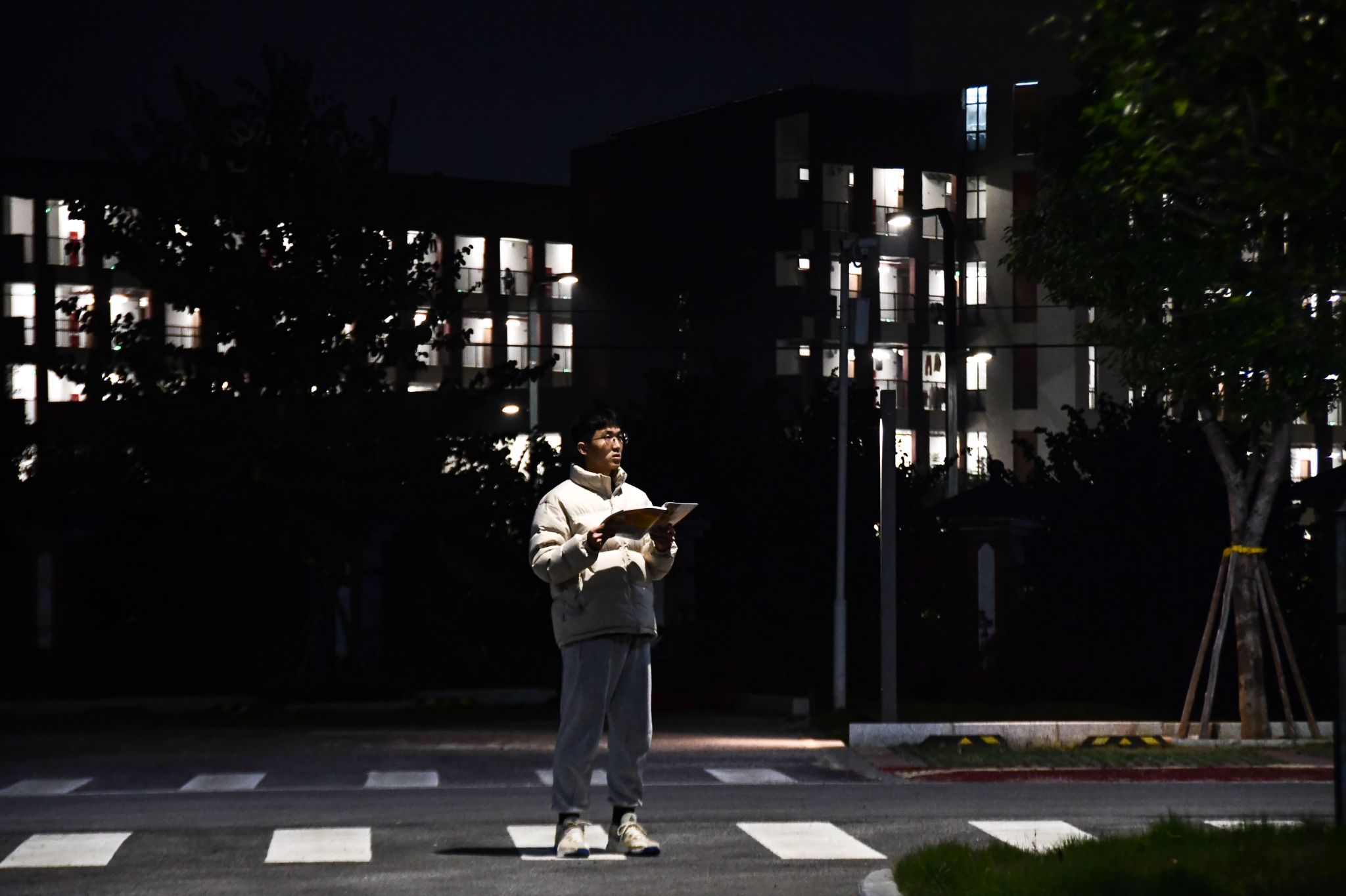 考研人夜晚路燈下背書