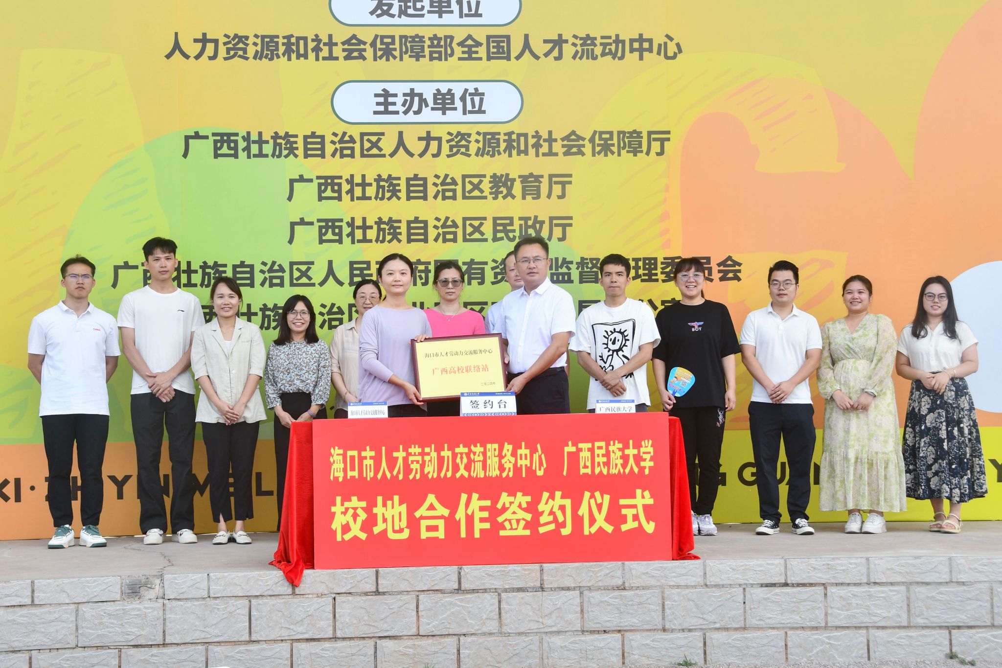 雙選會上,廣西民族大學與海口市人才勞動力交流服務中心簽署校地合作協議。