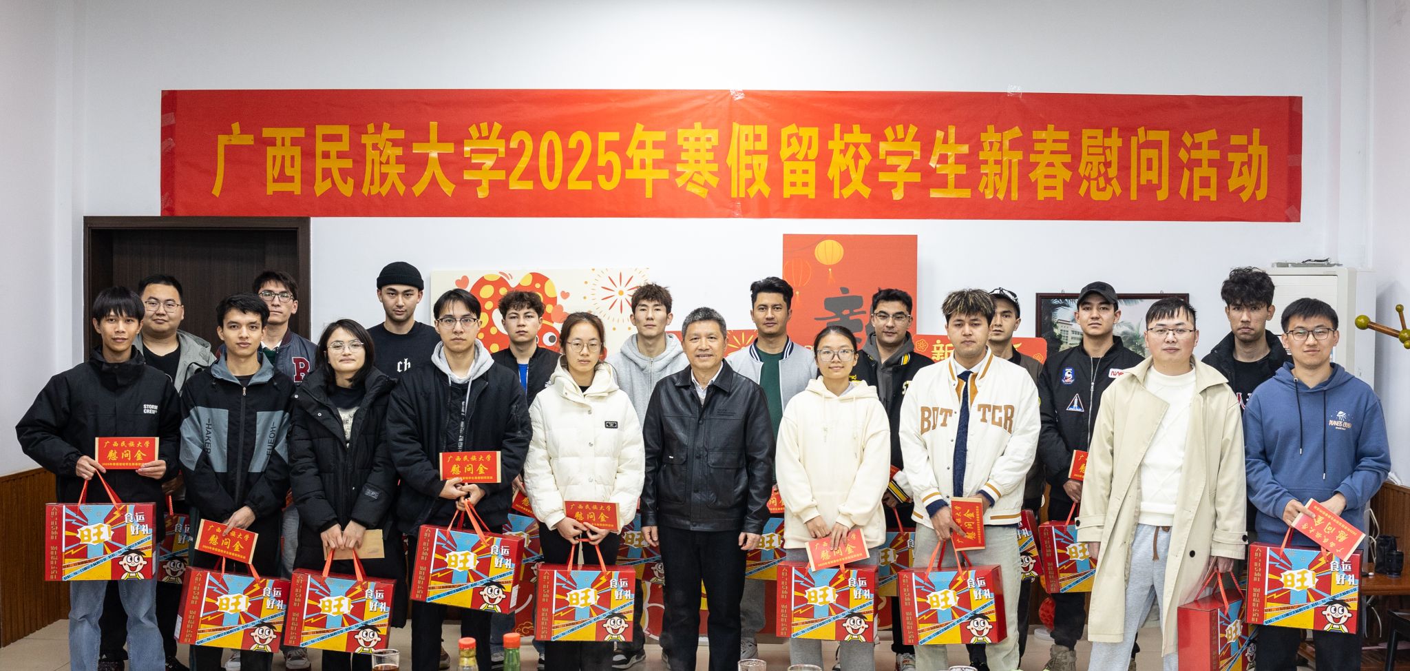 1月27日,在新春佳節即將來臨之際,廣西民族大學舉行2025年寒假留校學生新春慰問活動。副校長呂俊彪及學生工作部(處)、研究生院、校團委等部門負責同志親切慰問寒假留校學生,向他們致以溫暖的新春祝福和誠摯的節日問候。