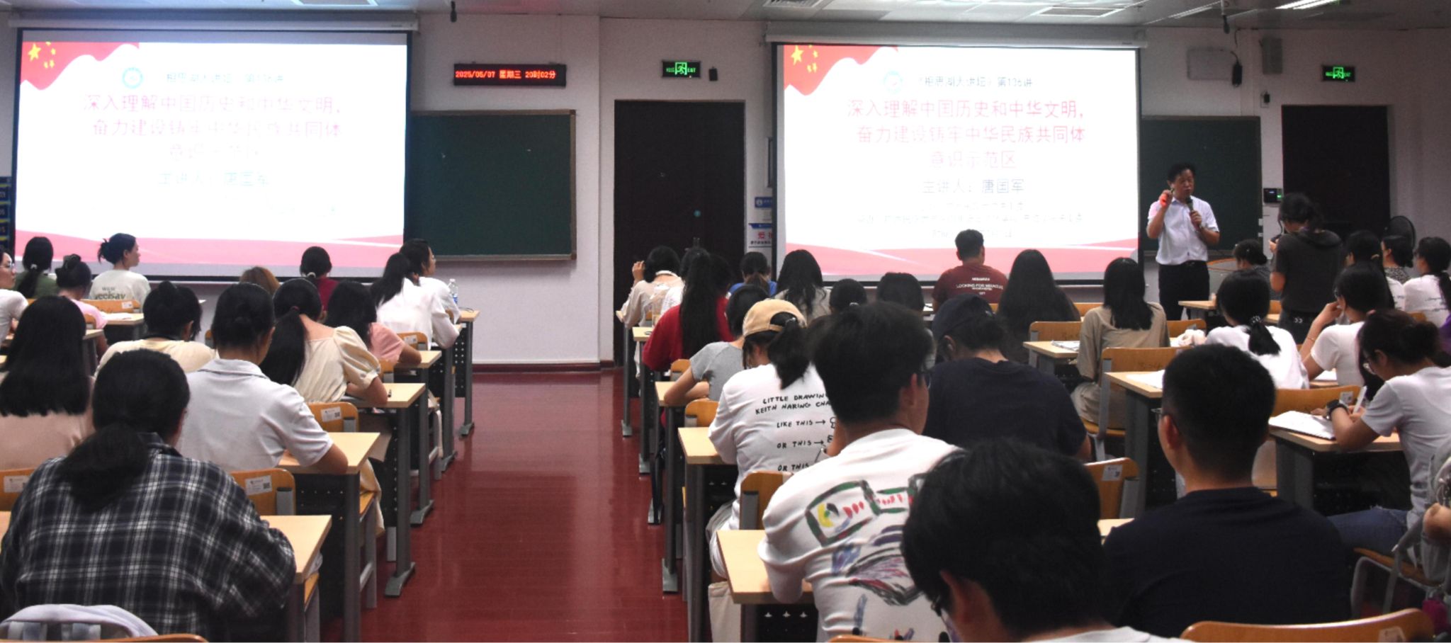 唐國軍從“理解歷史,樹立正確國家觀、文化觀、歷史觀和民族觀”“體悟中華文明五個特性與鑄牢中華民族共同體意識”“從歷史文化啟示中認識廣西建設鑄牢中華民族共同體意識示范區”等方面逐一展開講解。唐國軍表示,鑄牢中華民族共同體意識,需要學生們深入了解中國歷史和中華文明。在中華民族的交往交流交融中,“合”是主流,“交”是過程,“融”是關鍵,塑造了中華文明的連續性、創新性、統一性、包容性和和平性五大特性。